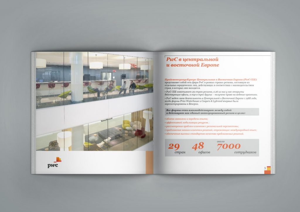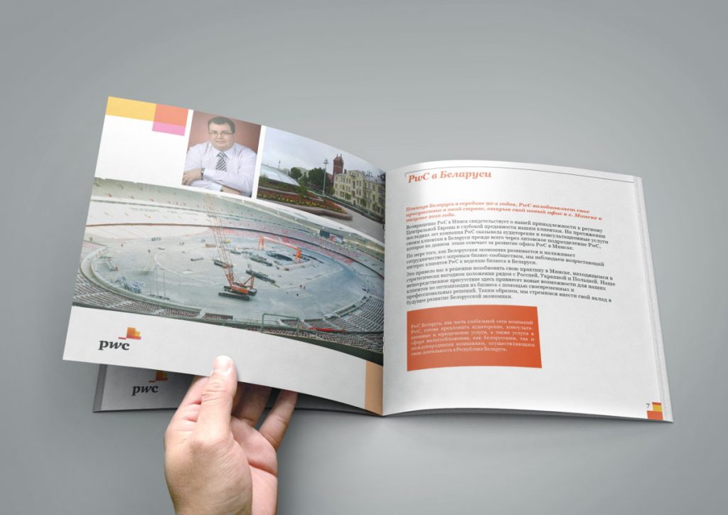 Описание: Дизайн и верстка адаптированной версии корпоративного буклета представительства компании PwC в Республике Беларусь.